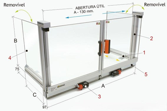 Proteção perimetral para instalação na mesa equipado com duas portas deslizantes com total abertura e painéis laterais removíveis.