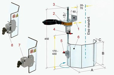 Instalado no lado esquerdo da máquina. A proteção semi-octogonal é verticalmente ajustável graças a dois sistemas diferentes: o grupo protetor-haste é ajustável através do grupo micro interruptor