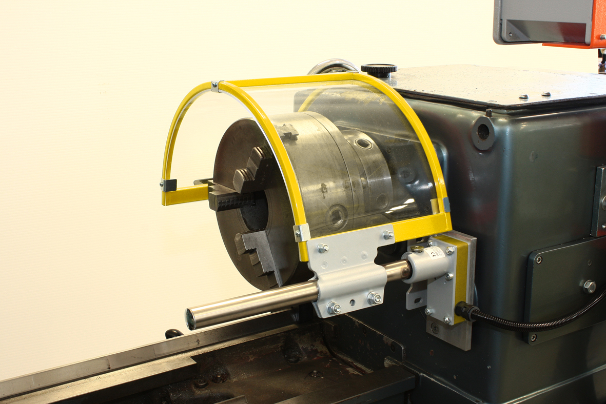 A sua forma particular permite um posicionamento da proteção completamente acima da árvore do torno, de modo a evitar a interferência com a área de trabalho.